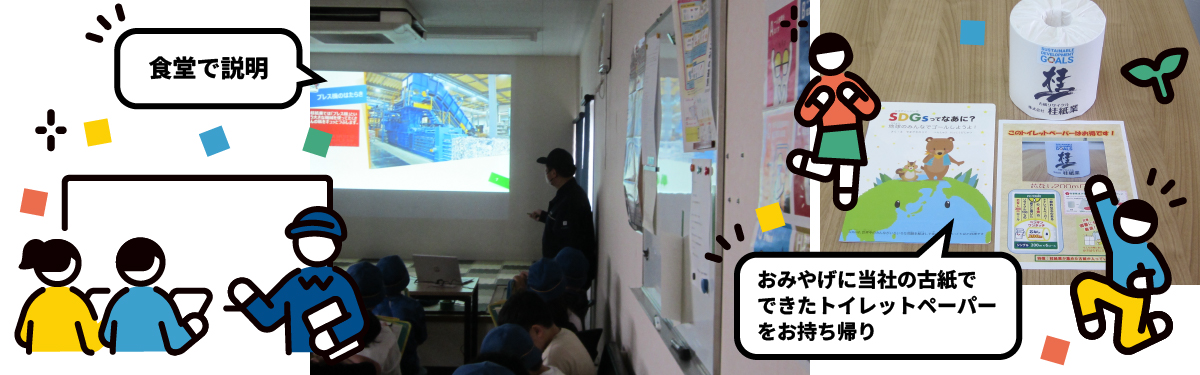 当日は、「工場の一日」というタイトルのもと、桂紙業の一日の流れを紹介しました。